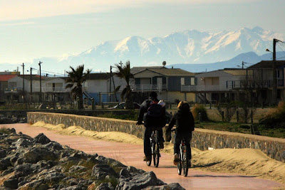 La suite s'enchaîne, des sentiers parsemés de cailloux ne demandant qu'à nous tordre la cheville et au loin un fabuleux panorama sur les étangs et le massif enneigé du Canigou.