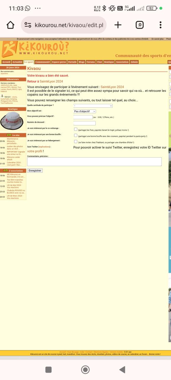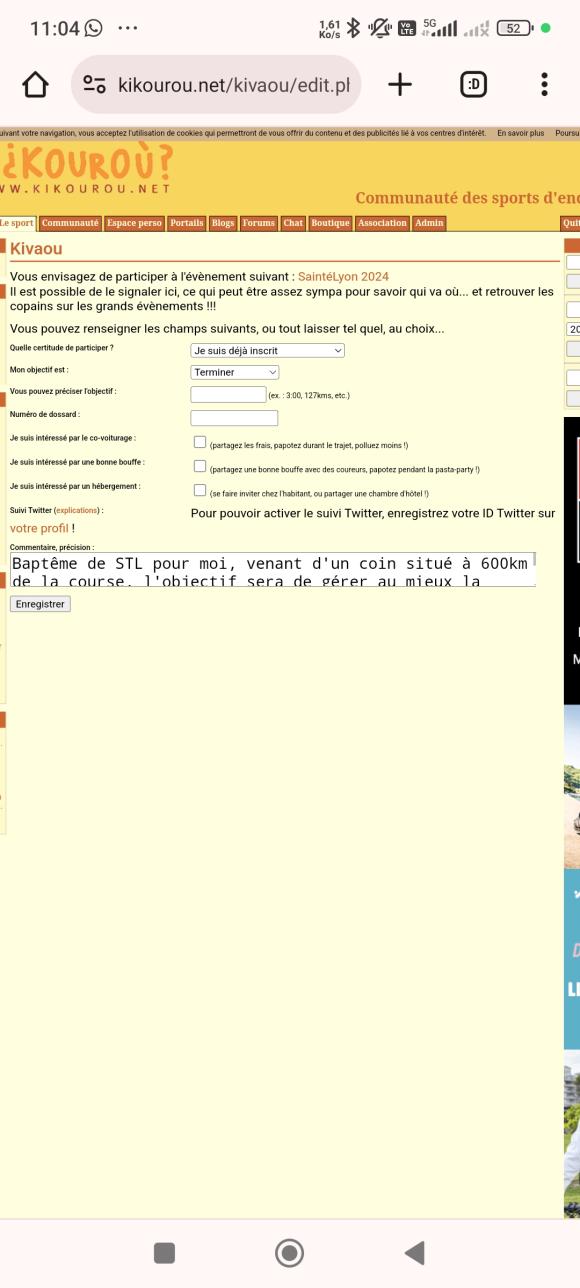 Mazouth a écrit:Effectivement, sur mon kivaou de la Moins'Hard, pour pouvoir ajouter mon n° de dossard il a fallu que je supprime le commentaire que j'avais mis il y a bien longtemps, avant la bascule de serveur.