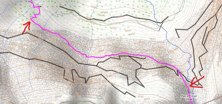 Et surtout, ça dure TRES longtemps! Je croyais me souvenir d'un passage de 100-200 mètres, mais en fait c'est acrobatique sur 1,4 kilomètre (la trace de ma montre est partie en live dans cet endroit très encaissé, mais j'ai remesuré sur la carte) et 250D-...en fait jusqu'au point où on arrête de descendre. Je vais mettre 45 minutes pour faire ce passage, tout en voyant face à moi les frontales des coureurs qui sont dans la "petite bosse" avant Barme.