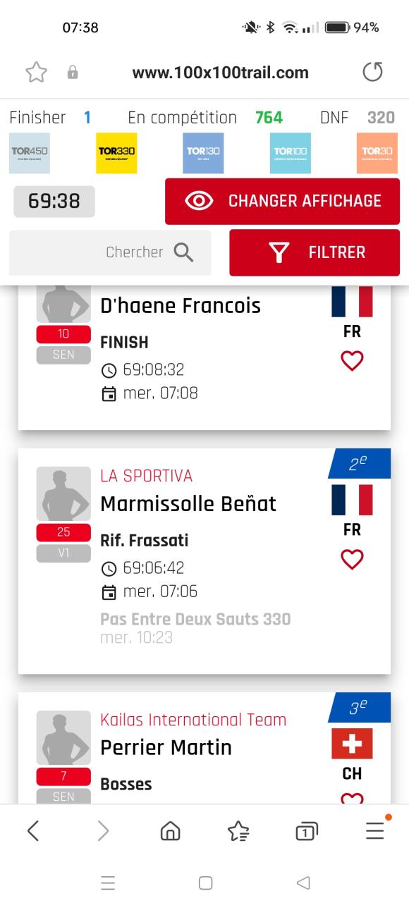 loiseau a écrit:Entretemps, François d'Haene est arrivé à Courmayeur, bravo à lui ! Avec Beñat Marmissolle pour l'instant deuxième et Martin Perrier troisième, on se dirige donc vers un podium 100% français