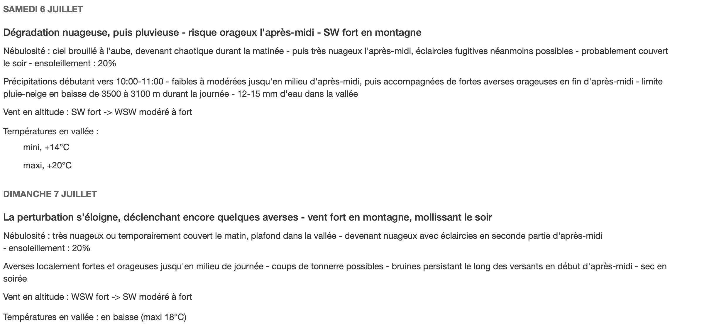 bubulle a écrit:Boutts67 a écrit:J ai vu la météo du week end sur Contamines et il prévoit de l orage une partie de l après midi le samedi.
