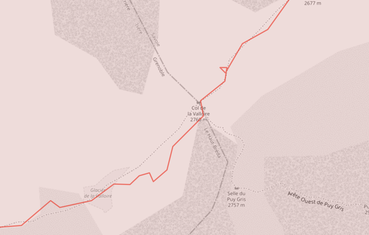 sur la carte IGN, c'est peut être le positionnement du nom "selle du puy gris " qui t'induit en erreur. La selle est plus à l'Est au point à 2 758 m et le Col de la Valloire au point à 2 751 m.