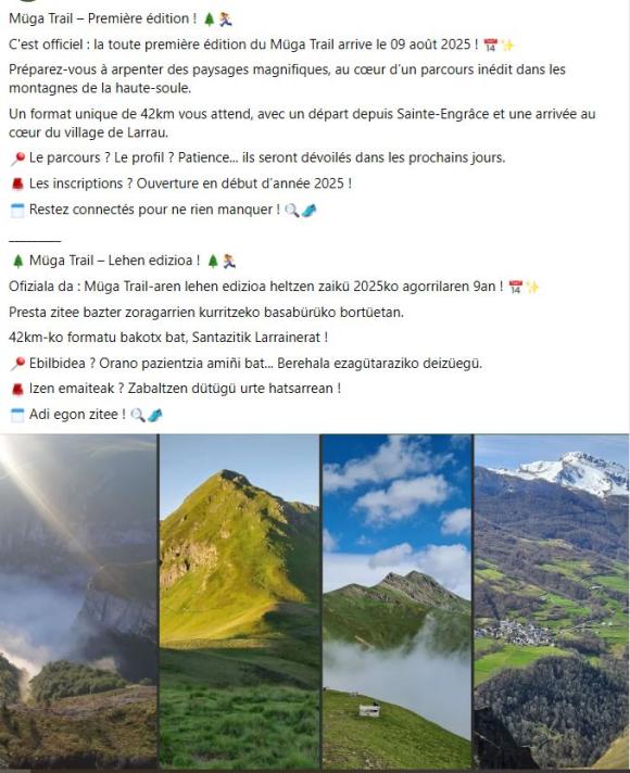 Tout d'abord, par ordre chronologique, l'Ouzoum Tour Trail au départ d'Arthez d'Asson le 22 juin sur les terrains d'entraînement de Maxime Cazajous, 2 distances de 20 (1500m+) et 30km (2300m+) Une orga solide expérimentée et de beaux paysages. Le Müga Trail, le samedi 9 août, au Pays Basque qui va remplacer le "feu" Xibero Holzarté Orhy Trail sur les mêmes terrains de jeu, qui sont ceux de Benat Marmissole. 42km et 2850m magnifiques autour des canyons de Haute Soule et du Pic d'Orhy...mais 300 dossards seulement. Trail en ligne entre les 2 villages de Sainte Engrâce et Larrau. Orga et paysages au top !