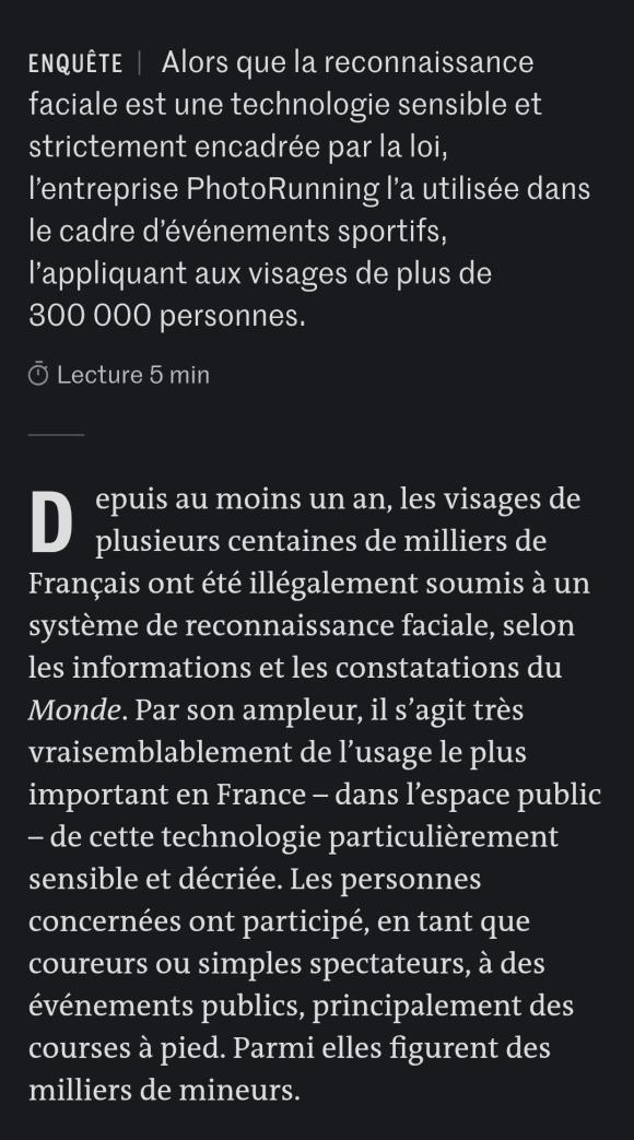 BBert a écrit:Comme l'annonce le titre, Le Monde vient de publier un article avec le constat qu'un logiciel de reconnaissance faciale a été utilisé illégalement par l'entreprise Photorunning dans de nombreuses courses organisées en France dont des courses de trail (SaintéLyon et Trail de Saint Jacques cités dans l'article).