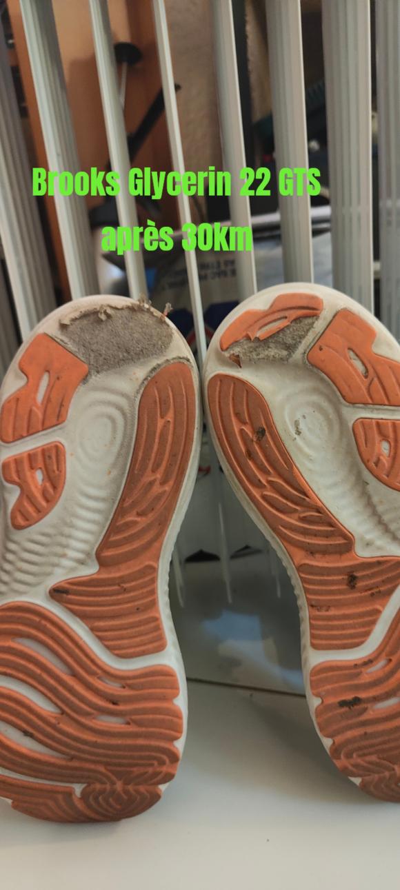 Bonjour , j'ai un gros soucis avec la marque Brooks . Je fais de la marche rapide ,10km à 7,7km/h de moyenne 185m D+ 160 D- , 3 fois par semaine sur route (alternant les chaussures )et voilà l'état de mes Glycerin 22 GTS après 2 sorties (20km) (voir photos) . Ces chaussures m'ont été conseillé et offertes par Brooks après l'usure prématurée (26km et arrachement de la semelle) de 3 paires de Trace 2 . Qu'en pensez-vous ?