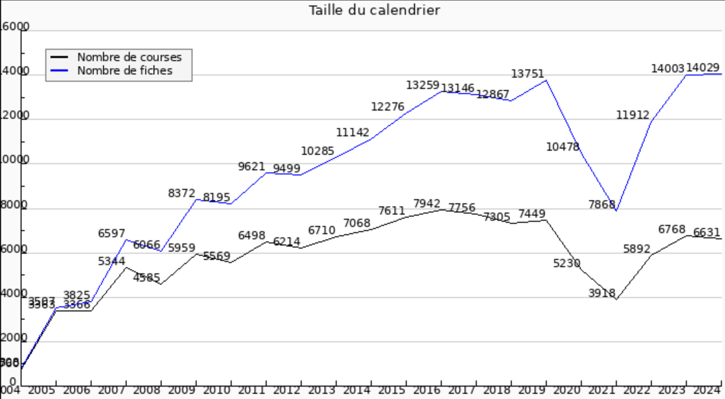 Le record de 13 751 courses enregistrées en 2019, a été battu en 2023, avec 14 007 courses ! Le record du nombre d'évènements uniques, 7 420 (toujours en 2019), tient toujours. Le calendrier 2024 a été mis à jour à 76% : avec déjà 10 400 courses, seul le calendrier 2019 était plus en avance à la même date (voir ici, avec notamment l'avancement du calendrier par département).