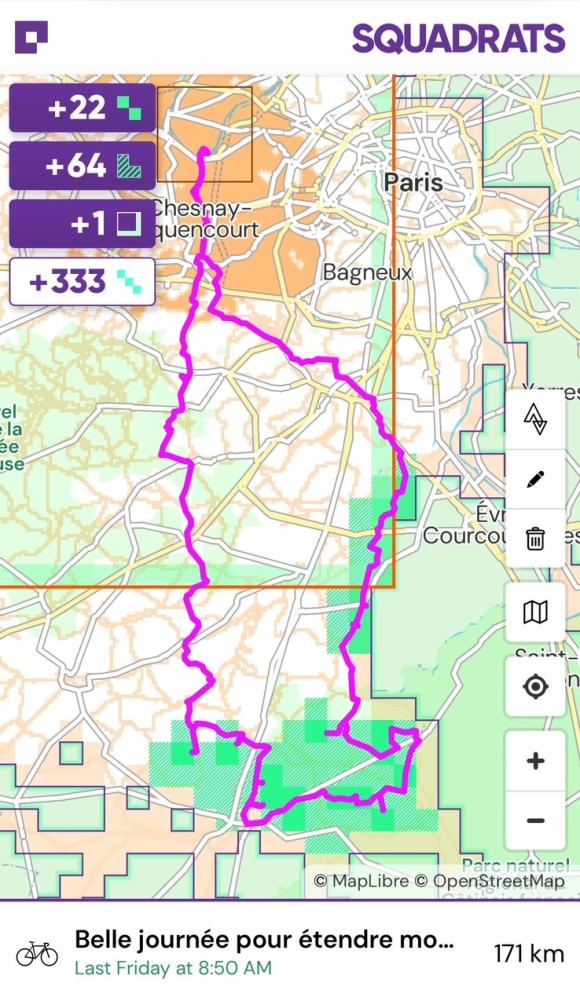 Sinon on peut pousser le tuc à l'extrême. Prendre la voiture, faire des pauses 'pipi' tous les 1.5km pour valider chaque carré du trajet![]()