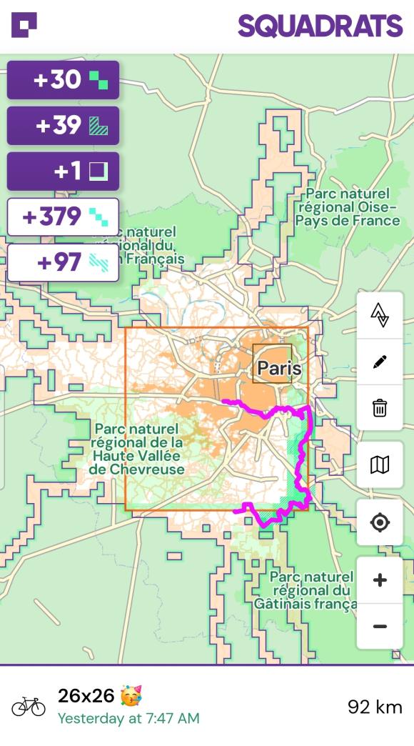 J'ai profité d'une belle journée ensoleillée ce vendredi pour améliorer mon taux de remplissage de l'Essonne (mais pas aussi vite que Bikoon :wink:), et par la même occasion passer les 800 au Yard et 21x21 au übersquadrat.