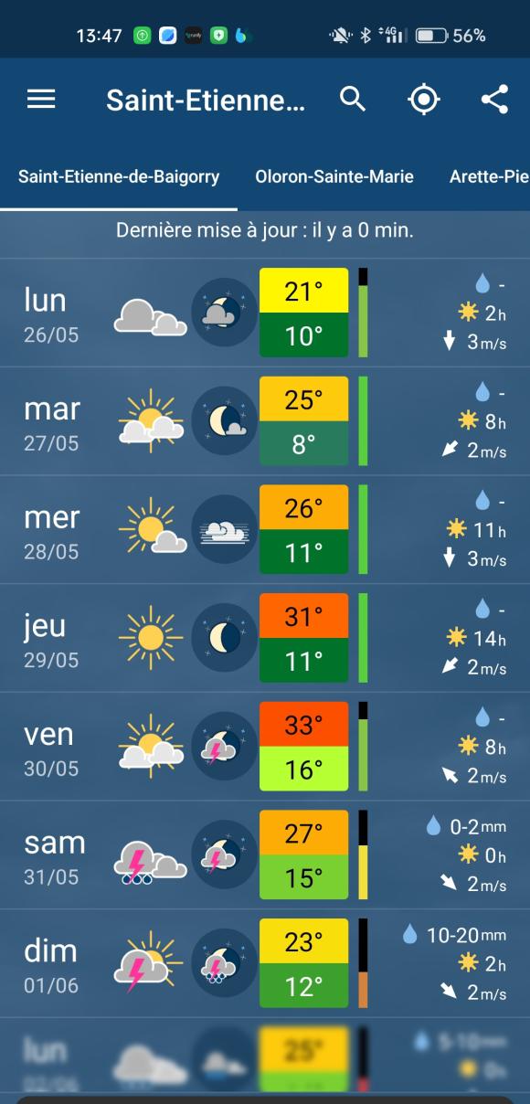 Météo France prévoit maintenant de possibles orages le vendredi après-midi - pas étonnant si on atteint réellement les 34.
