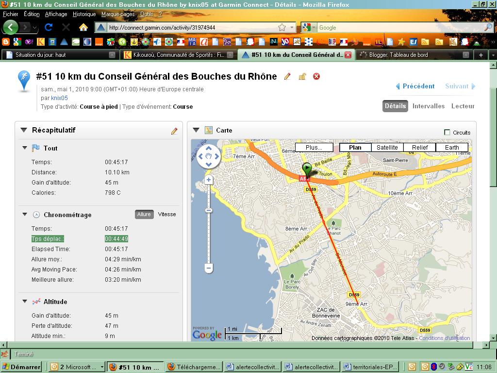 Cependant, le chrono officiel enregistré par kms est 45'05" au lieu des 44'49" de mon GPS concernant le temps effectif de déplacement. De plus, j'ai appuyé quelques 20' après la ligne franchie.