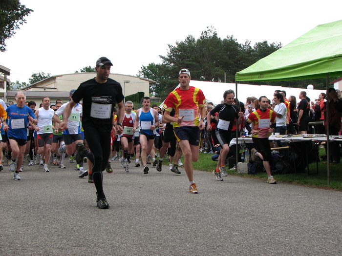 Petites discutions sur l'ordre des relais, personne n'est vraiment motivé pour prendre le départ. Perso je met un véto, avec mes tibias en feu je veux prendre le temps de m'échauffer correctement. Je pars d'ailleurs faire un tour de reconnaissance, bof bof bof. Je reviens juste pour le coup de pétard. Beau peloton de 62 individuels et 60 équipes. C'est finalement Benjamin qui s'élance pour nous. Un gars en noir fait le holeshot du siècle, suivi par Benjamin, Mika, et 2 autres équipes de Villemoirieu. De bonne augure. On m'assigne finalement le 3ème relais, ce qui me laisse le temps de faire un deuxième tour d'échauffement un peu plus rapide. C'est toujours pas ça, mais ca m'empêche pas de courir, faudra voir ce que ca donne dans le temps. J'en profite pour encourager tous les marcheurs et coureur solo que je double sur le parcours. On va se croiser un certain nombre de fois aujourd'hui, mais j'aurais pas toujours la réserve pour les féliciter.