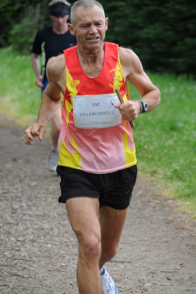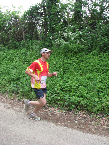 Je monte à bon train, passe le raidillon pas trop mal. Je trouve par contre que j'ai du mal à relancer sur le faux plat qui suit. Coup d'oeil au chrono, les intermédiaires sont bons. Je traverse le champ d'herbe, pas de vent cette année, c'est mieux. La sortie du champ annonce la mi-parcours. Retour par une longue descente en bitume. Je me rappelle que l'an dernier j'en avais un peu gardé dans cette descente sur les premiers tours. Et là je me sens plus bridé, j'avance pas vraiment plus vite mais je suis plus haut en intensité. J'en remet une petite couche dans les p'tits coups de cul du final, et file le témoin à JC. 7'30, identique à mon 1er tour de l'an dernier, mais en ayant eu l'impression d'être moins facile. Je ne m'affole pas, la mémoire est souvent trompeuse avec la pénibilité des efforts.