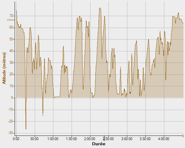 On va surtout monter puis descendre puis monter puis descendre puis... comme l'indique ma courbe de dénivelé GPS :