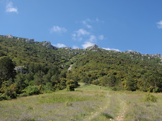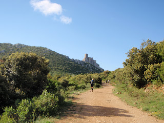 Suit un bon bout de piste légèrement vallonnée et un peu de route pour arriver sous le château de Peyrepertuse.