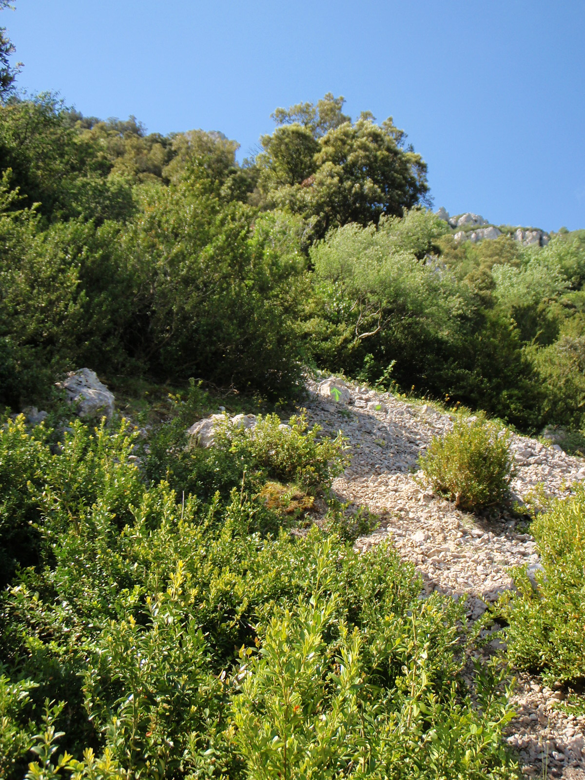 Passage dans un pierrier. Les appuis sont du genre fuyants. Tel le chien moyen j'utilise mes 4 pattes pour être plus stable et ne pas reculer...