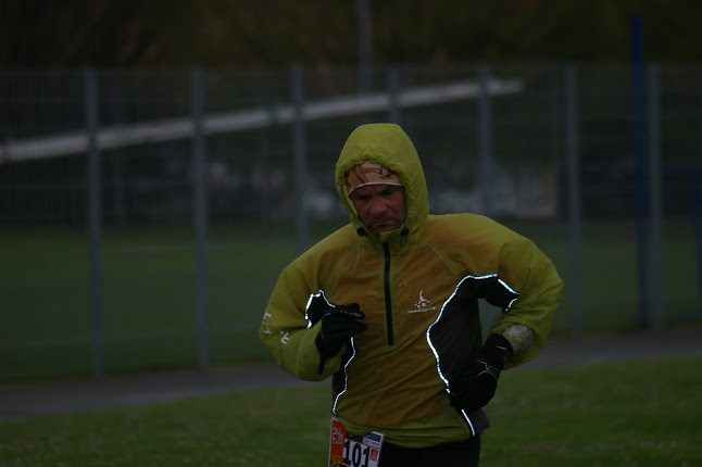 Après 2 tours "découverte" premier arrêt au ravitaillement pour boire un coup. Et c'est reparti. Dans ma tête je valide le rythme 2 tours/ 1 arrêt boisson qui me parait convenable vu les conditions. Ah oui tiens, il fait quel temps? Et bè c'est pas la canicule... Fais même un brin frisquet! Quoi 1 heure de faite déjà? un poil plus de 8 bornes au compteur. C'est nickel mon petit gars. Je suis tranquille, je suis peinard, je n'oublie pas de boire (et de manger aussi...). C'est vraiment cool ces messages d'encouragements à lire régulièrement. Par contre je trouve que ça caille un peu alors petit arrêt à mon stand pour enfiler les gants. Ah tiens en plus il commence à bruiner. C'est moyen mais on va faire avec. J'hésite pendant 2 ou 3 tours à m'arrêter pour mettre la veste sans m'y résoudre.