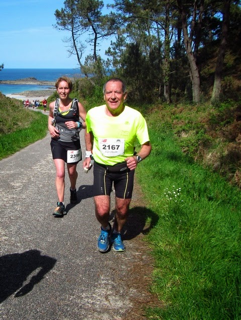 C'est en remontant de la plage du Guen que nous rejoignons Jean-Claude, notre Robocop41. Il reste 6 km et Katia va réussir l'exploit de prendre plus de 2 min au km à ce sportif exceptionnel de longévité. Il faut dire que nous abordons le Cap d'Erquy et qu'il s'agit de son terrain d'entraînement de vacances, sa famille habitant la commune. A partir de cet instant, notre bretonne laisse parler sa Fúria Català. Rien ne lui résiste et surtout pas les quatre ou cinq filles qui la précèdent.
