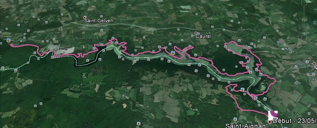 Nous sommes dix Écouviens à participer à un trail ou un autre, je suis le seul glandu du groupe et le plus âgé des hommes à courir les deux ! Le départ est donné à St Aignan, en pleine campagne, histoire de fluidifier le peloton. Oui, mais ça commence par 1,5 km de mur sur lequel il est hors de question de courir, résultat, dès la première descente, on se croirait un vendredi soir en région parisienne.
