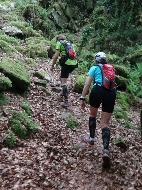 Après le 40ème km, nous nous engageons sur des chemins pour moi inconnus. Le terrain étant très pentu, j'instaure un rythme très particulier de marche suivi de course courte sur chaque faux-plat de quelques mètres disponibles pour obliger les muscles à travailler, ce qui leur évite de durcir. Résultat, au 50ème km, nous sommes toujours en mesure de descendre et de sauter les obstacles sans douleur.
