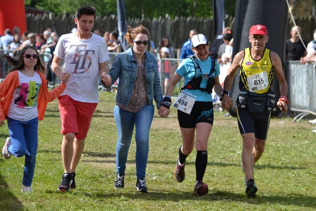 Toute la famille est là pour l'arrivée et les jeunes qui arrivent à suivre nos 12 km/h finissent avec nous. 9h37 de course et 470 places gagnées depuis le départ, Cathy peut être fière de ce trail couru sur les terres de son clan.