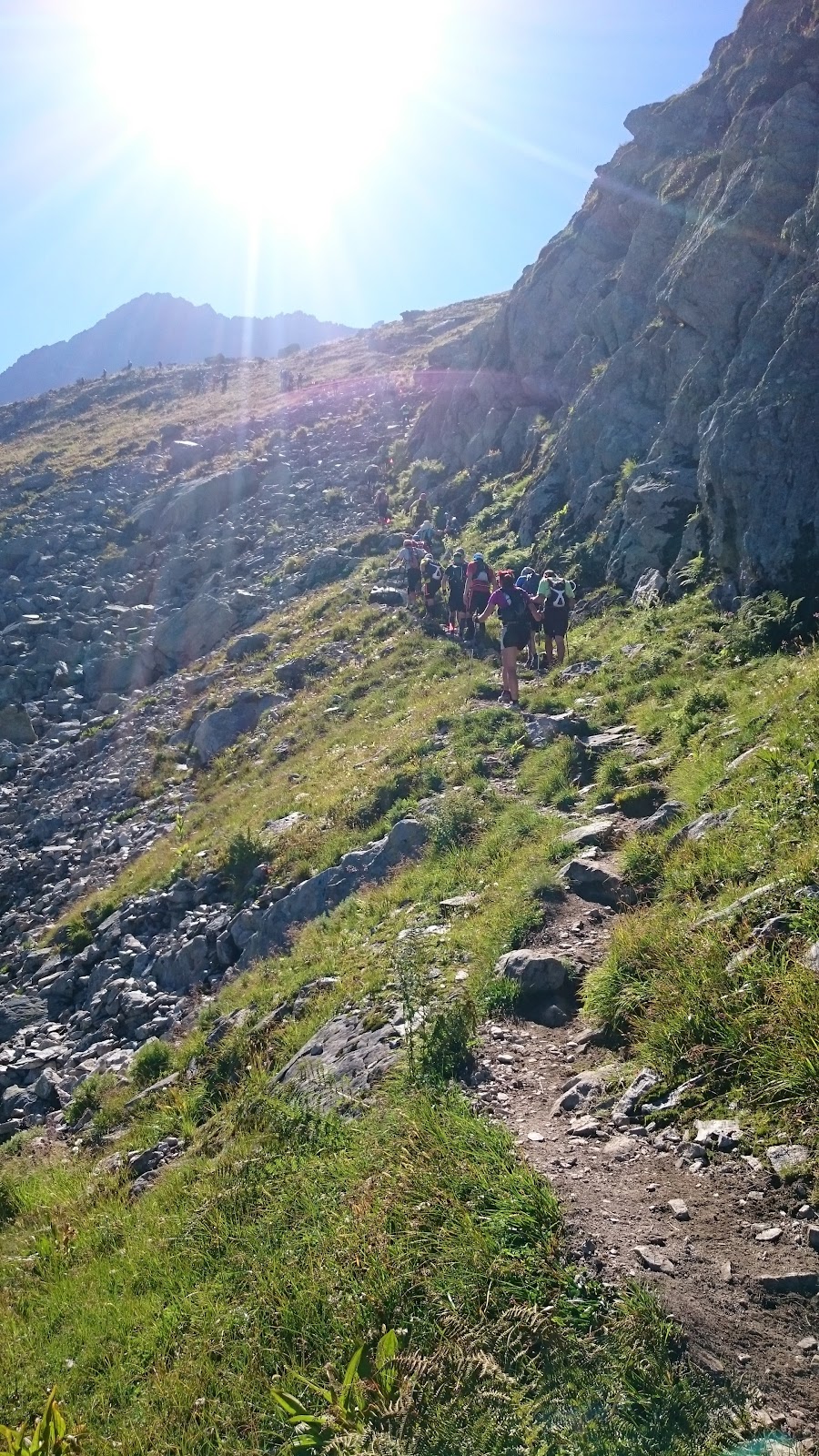 Au programme un sentier relativement glissant, parfois en devers, pour rejoindre à nouveau l'itinéraire du 144 puis le refuge de l'Oule à 1836m qui marque le début des hostilités jusqu'au col Moretan (2503m). Tout va bien, je m’attendais à souffrir dans cette montée de 2km dont quelques centaines de mètres dans de gros cailloux parfois instables, mais début de course aidant, j'avance très tranquillement, la chaleur ne me dérange pas et je ne ressens même pas le besoin de plier mes bâtons. Je n'ai posé les mains que sur les 20 derniers mètres il me semble, du coup j'arrive au col avec la patate.