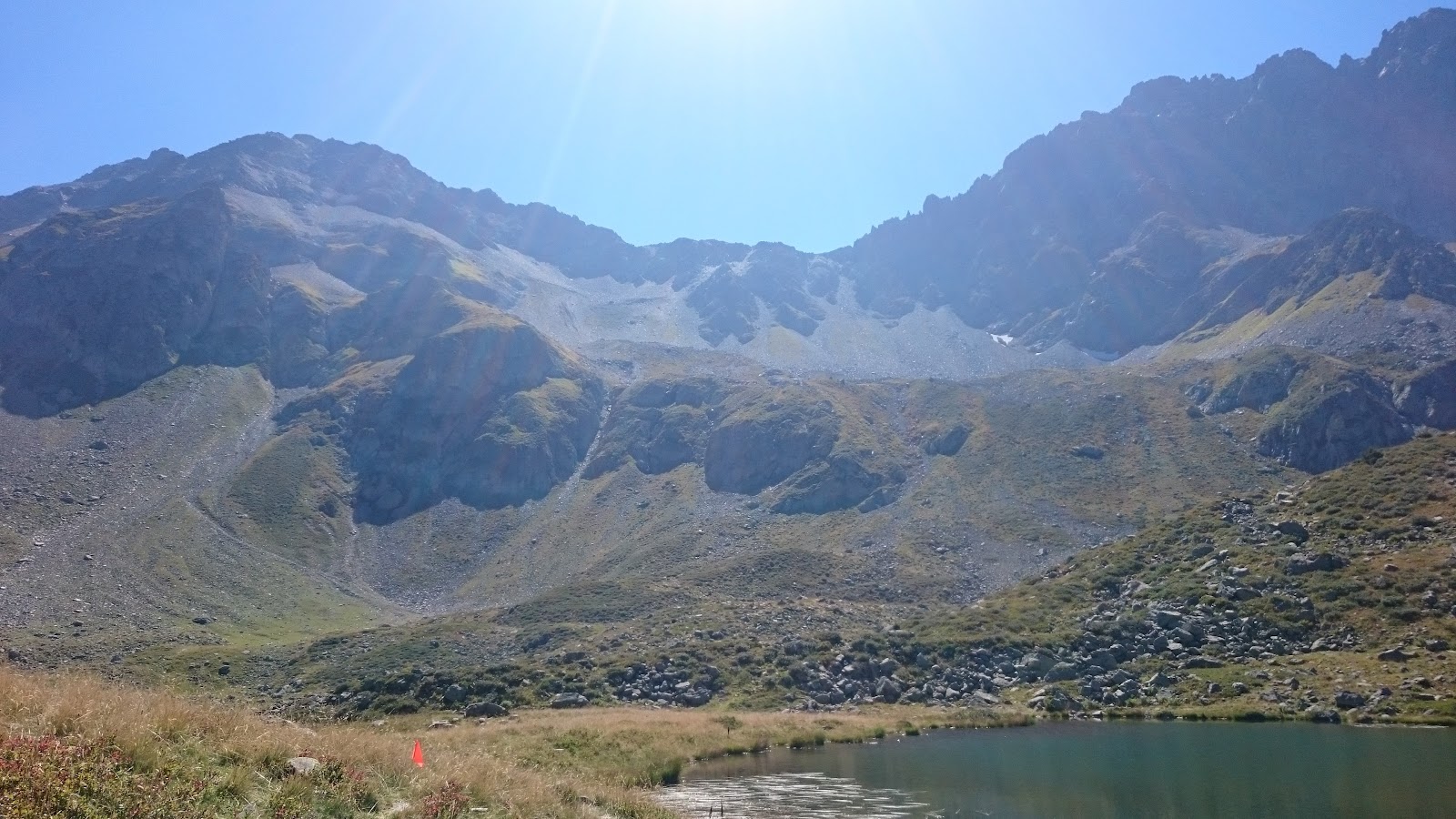 Ce refuge est l'occasion d'un énième pause, d'un peu de coca, d'une part de cake et de repartir en oubliant mes bâtons. Heureusement je m'en rends compte assez rapidement pour revenir, la pente nous laisse un peu de répit, j'ai l'impression que mon état s'améliore, il fait moins chaud en ce début de soirée, le paysage est époustouflant, le col d'Arpingon devrait se dévoiler bientôt, je suis content.