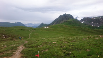 J’avance légèrement plus vite que les coureurs autour de moi, si bien que peu après le lac d’amour je rejoins un coureur à affubler d’un buff Kikourou : c’est Yves94, il est en préparation pour le grand raid, sans bâtons donc, et il a l’air en pleine forme. Passer le lac, c’est le col à Tutu qui s’annonce de loin grâce à des banderoles "SAVOIE", il y a pas mal de spectateurs sur ce passage, ça pousse à ne pas se relâcher. Derrière le col une courte descente technique avant un sentier relativement facile vers le refuge de Presset me permet de reprendre un peu de force.