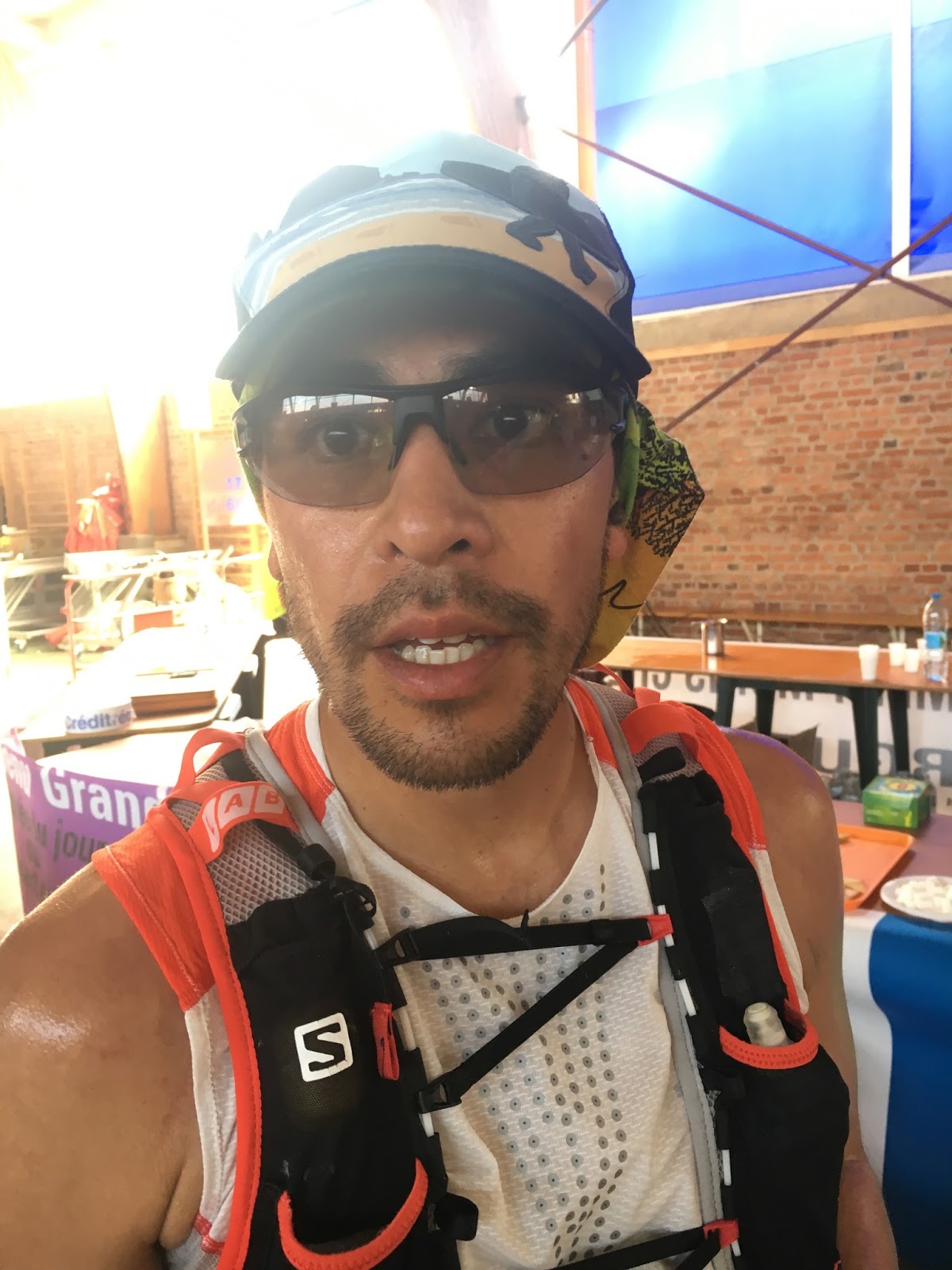 je suis un peu fatigué et j'ai hâte de m'étendre. Nous sommes 6 dans la salle de repos qui jouxte la halle de sport et les bandas qui jouent dehors n'aident pas a fermer l'oeil , j'aurais dû prendre des boules quiès...Derniers préparatifs, j'ai juste envie d'y aller mais il reste encore quelques heures de sommeil qui se feront rares car même au beau milieu de la nuit il y a des gens qui crient et on entend des encouragements de coureurs qui passent, je dors peu et à 4 heures je suis bien réveillé... 4H15 ca commence a bouger et les gens se réveillent doucement pour s'habiller .