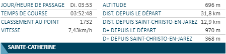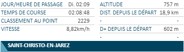 A 3h53 j’entre dans la zone de ravito où je vais, comme prévu, faire ma plus longue pause. Remplissage des bidons, soupe, sandwich saucisson-fromage et go, le tout en 7 minutes ! Je m’étais mis comme objectif d’arrêter de perdre du temps sur les ravitos, là on est bien.