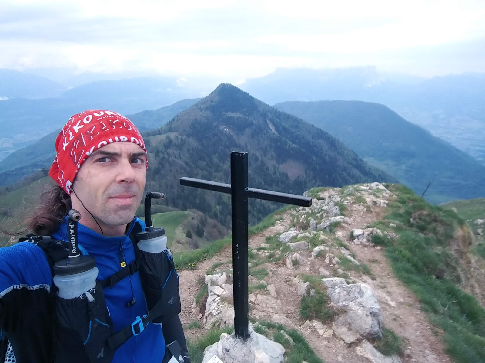 Plus de 3,5 km et 700 mD+, en plusieurs phases bien pentues avec quelques vagues et brefs replats (rien n’est jamais plat de toute façon dans les Bauges), et un final plutôt raide. J’avance lentement mais sûrement, souvent seul au début, je double ensuite quelques gars, d’autres me rattrapent parfois, dont le surnommé dca, un Kikouroù avec qui nous allons faire des chassés croisés pendant des heures (lui plus rapide en montée, moi plus en descente). Pas grand-chose d’autre à signaler pendant cette heure et quart de montée à part des détails : d’abord comme je suis souvent seul, j’ai sorti le MP3 que je vais garder sur les oreilles jusqu’au Mont Pelat (plus ou moins), ensuite j’ai fini par me rendre compte que j’avais encore ma frontale sur la tête…