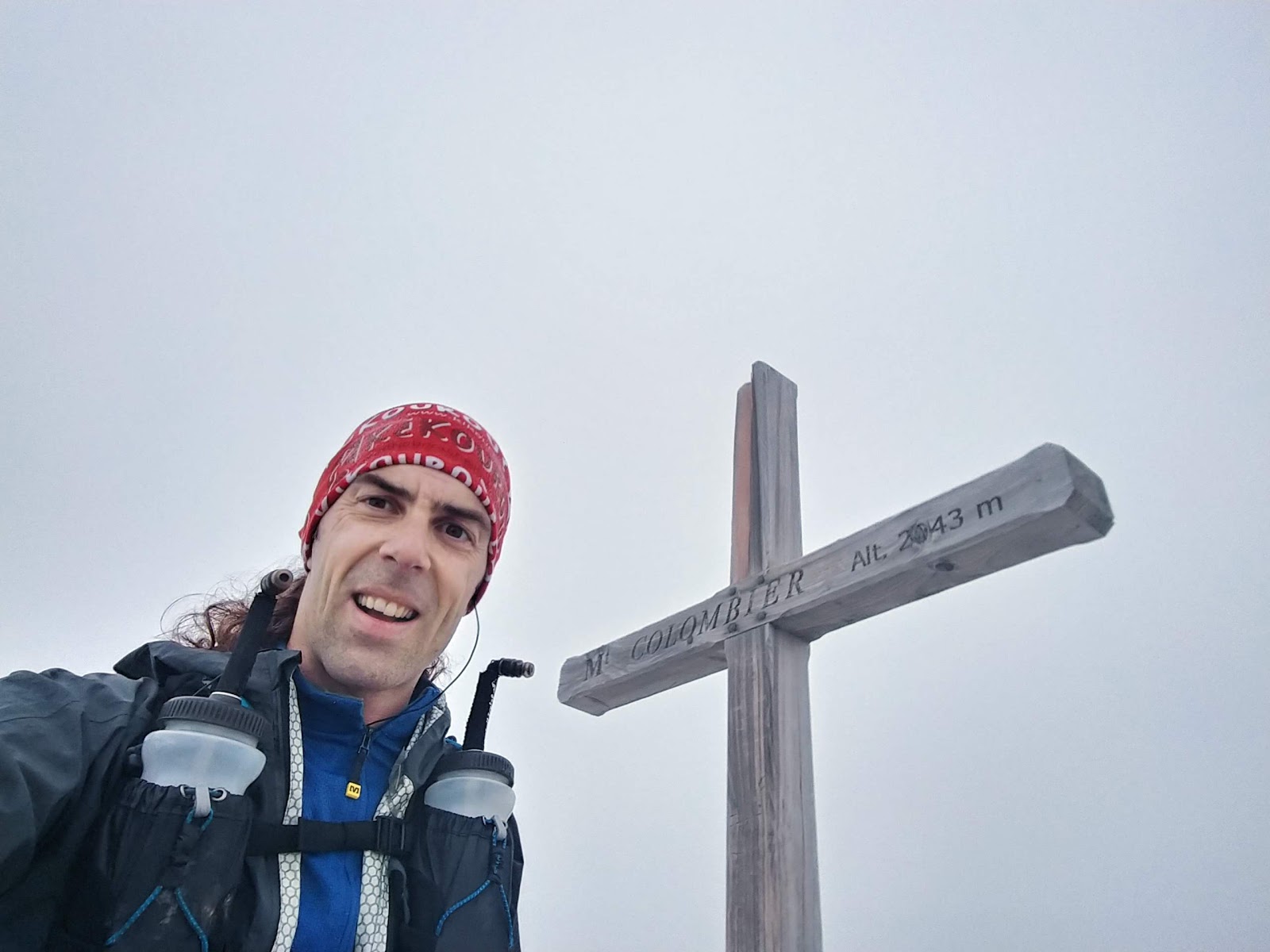 A 16h15 le sommet est atteint ! J’adore cette sensation rare pour moi qui ne vais pas souvent en montagne. Je fais quelques photos vite fait, mais comme il ne fait pas beau et qu’il fait frais, ça ne me prend pas bien longtemps, et je plonge dans la descente, à peu près aussi raide que la montée, en m’aidant des bâtons pour soulager mes jambes déjà bien entamées.