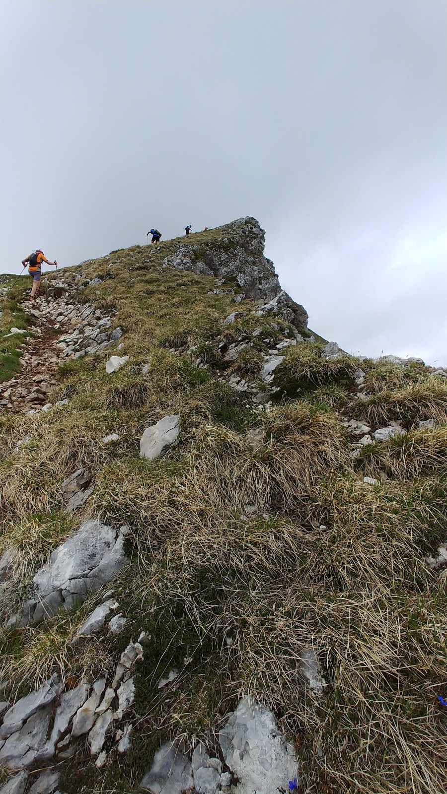 On est tous à deux à l’heure ici. Le vent souffle, je remets ma veste pour ne pas prendre froid. Et je profite, tout en mettant un pied devant l’autre, de la vue depuis la crête du Colombier. Le sommet est tout près, on le voit maintenant, presque dans les nuages, tant pis pour le panorama.