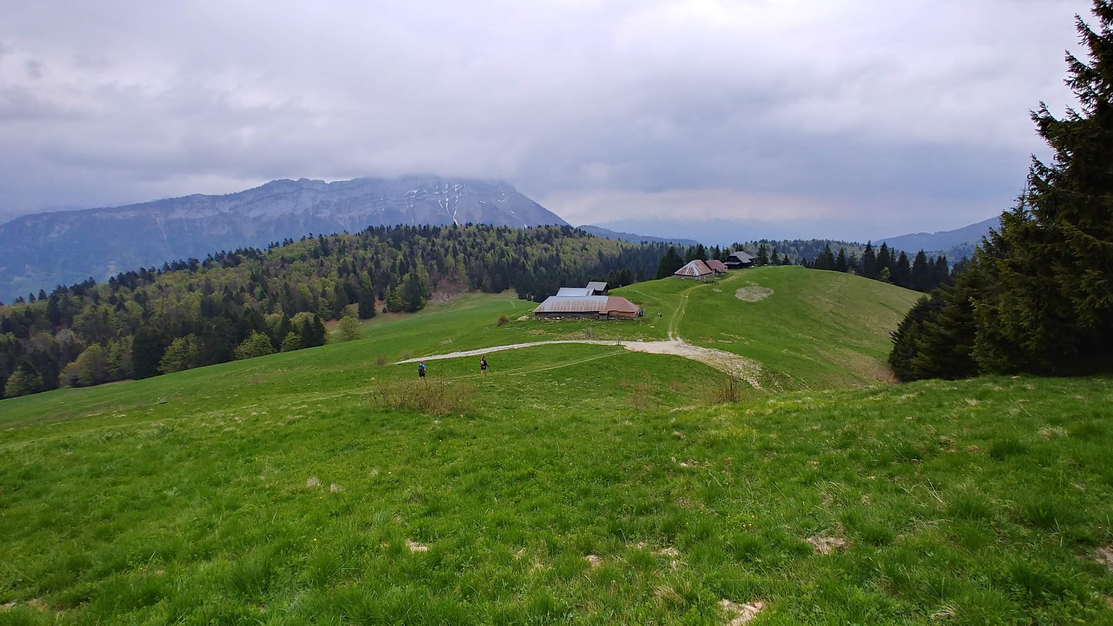 Le chemin jusqu’au Pelat est irrégulier. Il alterne des passages assez roulants avec des coups de culs et des petits singles rigolos en forêt. Puis on débouche sur un petit chalet d’alpage avec une vue imprenable à l’est sur la Dent d’Arclusaz (petite pensée pour Laurent ;) ) qui est un peu embrumée, et ça ne va pas s’arranger. En effet alors que j’entame la montée de 200 mD+ sur le Pelat, le ciel noircit à l’ouest. Jusque-là on avait juste eu des petites gouttes par-ci par-là, nickel pour se rafraichir, mais cette fois on va y avoir droit. A moins d’un kilomètre du ravito je dois remettre la veste car l’averse est là pour de bon, et ça mouille !