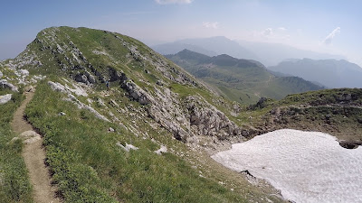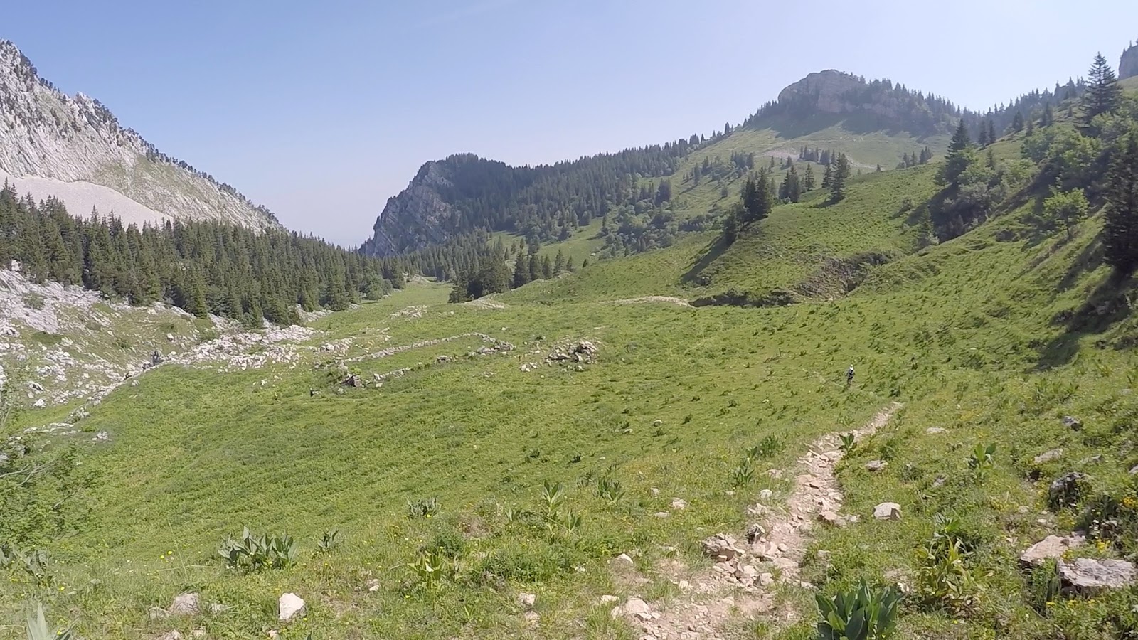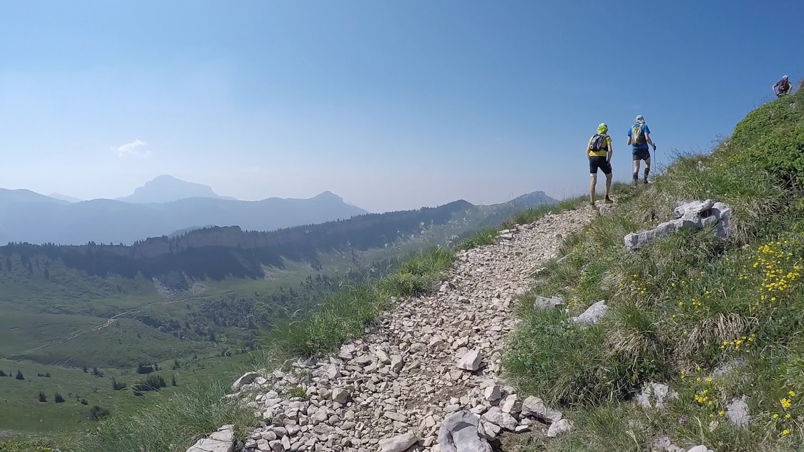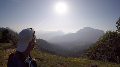 On prend de plus en plus de hauteur, laissant entrevoir l'étendu de ce massif de Chartreuse. Avec la chaleur, la brume s'est bien installée dans le paysage, limitant la visibilité aux massifs plus éloignés comme Belledonne.