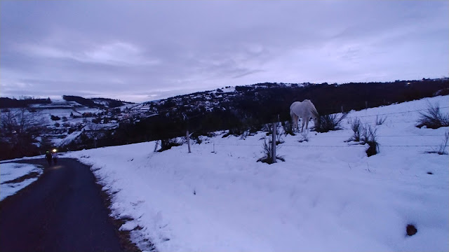 J'arrive sur le chemin accidenté et descendant, pas trop enneigé, je m'amuse bien, et me voici déjà sur le pont qui enjambe la Loire. Au 35e kilomètre ça marque la mi-course. Ca veut aussi dire qu'on va se taper une bonne remontée, sur la route. Je passe donc à la marche, d'un bon pas, mais il y en a deux qui ont un pas encore meilleur que le mien, je veux bien sûr parler de Thierry et Bernard que re-voici. Je prends leur sillage un moment avant de devoir faire une rapide pause pipi. Je remets la machine à marcher en route, les rattrape et prend la tête du train. J'ai la patate, je relance sur le faux-plat montant qui suit, et ça galope toujours bien dans la descente jusqu'à Confolent.
