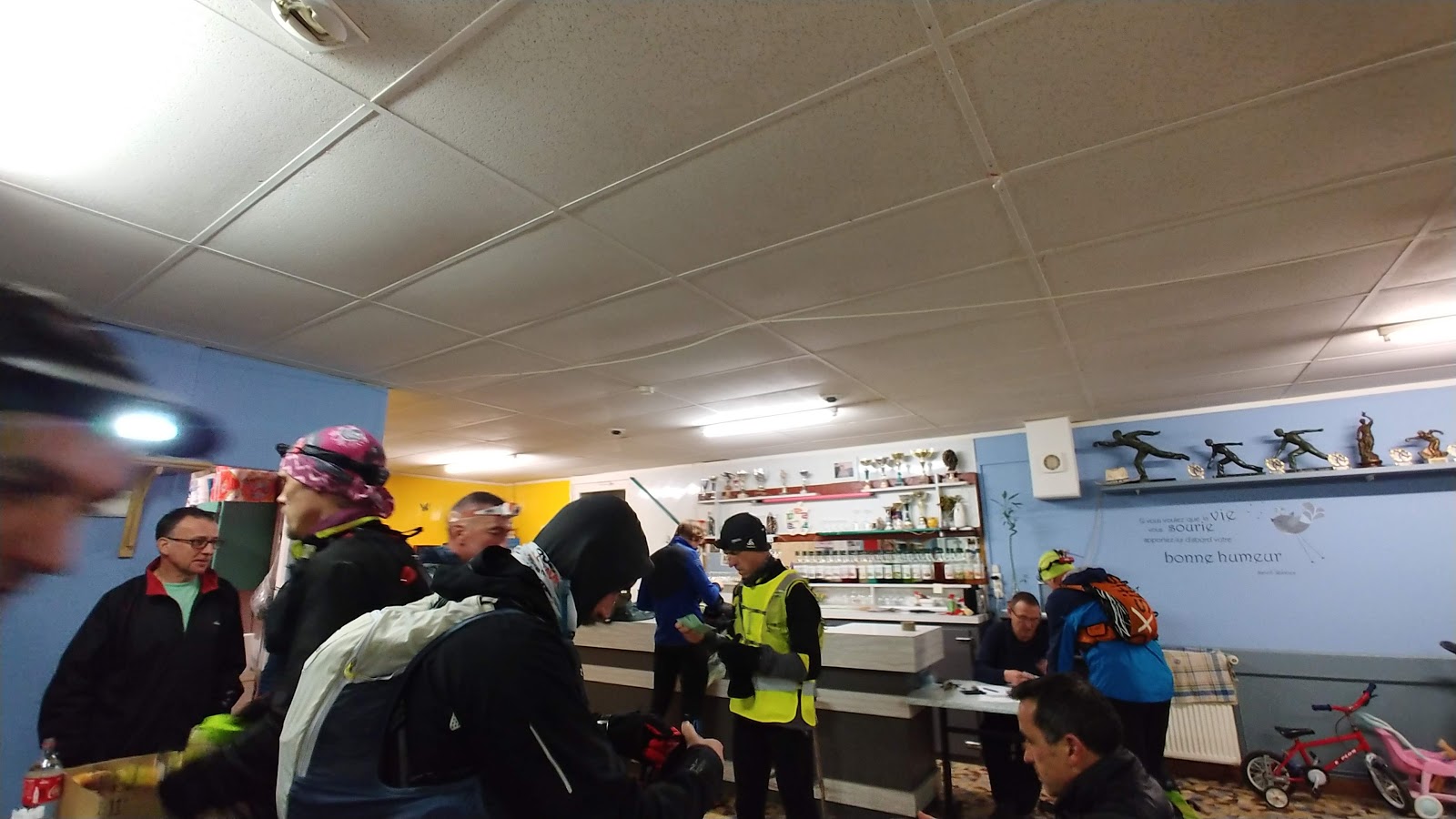 Km 42, 4h40 : Nous entrons tous les trois dans l'amicale bouliste de Confolent, ce charmant bistro où il fait bien chaud, au moment même où Christian en repart. D'ailleurs sur le coup je ne l'ai même pas vu, ce n'est qu'en montant mon film que j'ai vu qu'il était là... le manque de lucidité commence à poindre.