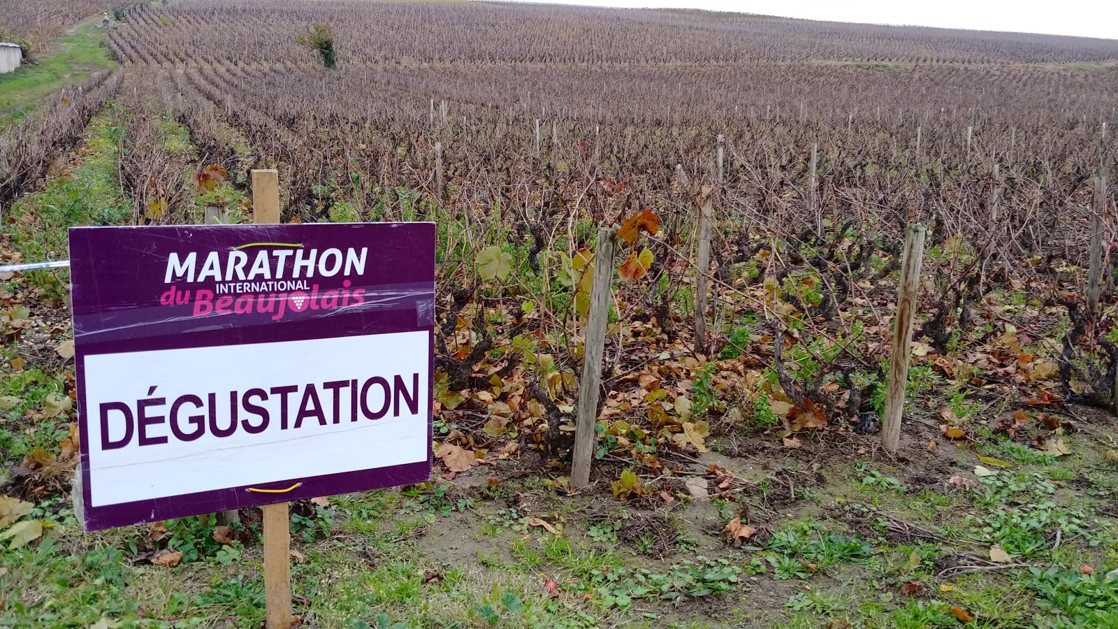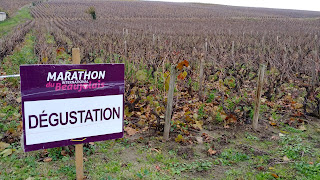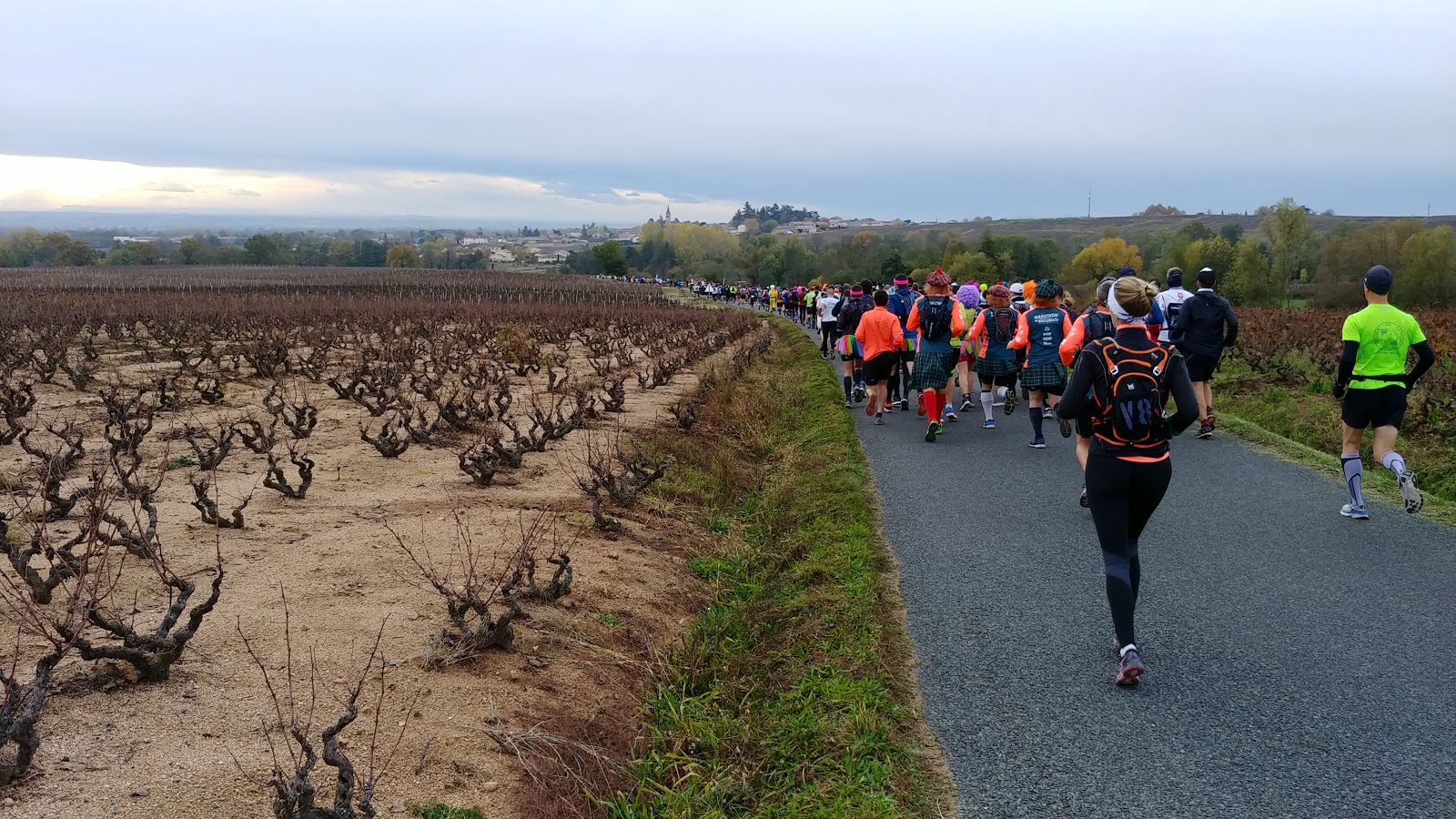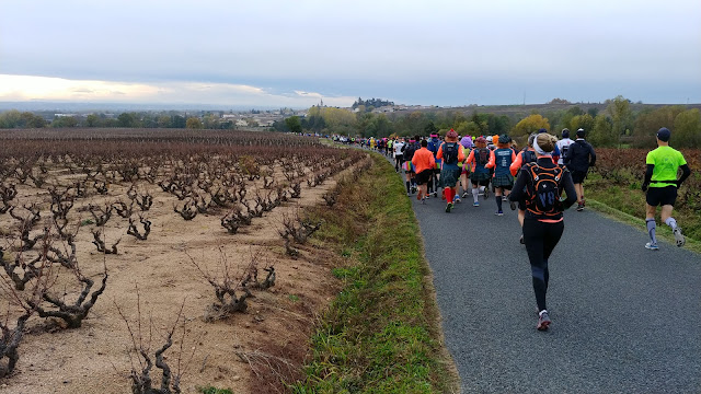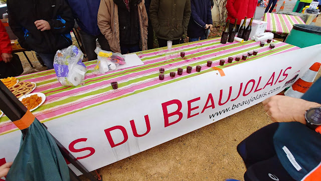 Pour cette dernière course de ma saison 2019 je venais avec un objectif : profiter de l'ambiance et surtout boire un verre de Beaujolais à chaque ravito ! (ne faites pas ça chez vous...). Comme je disais à Rémi dans la voiture en venant, entre les arrêts et le vin, je pense mettre dans les 5 heures pour boucler tranquillement ce marathon. Et puis tout s'est emballé (surtout mes jambes et mon enthousiasme), et j'ai couru, et bu, et couru de plus en plus vite, porté par ma bonne forme du moment et désinhibé par l'alcool, j'ai fini comme un dératé en 3h52, et en ayant bu mon verre à chaque ravito, jusqu'au bout, mission accomplie dans la joie !
