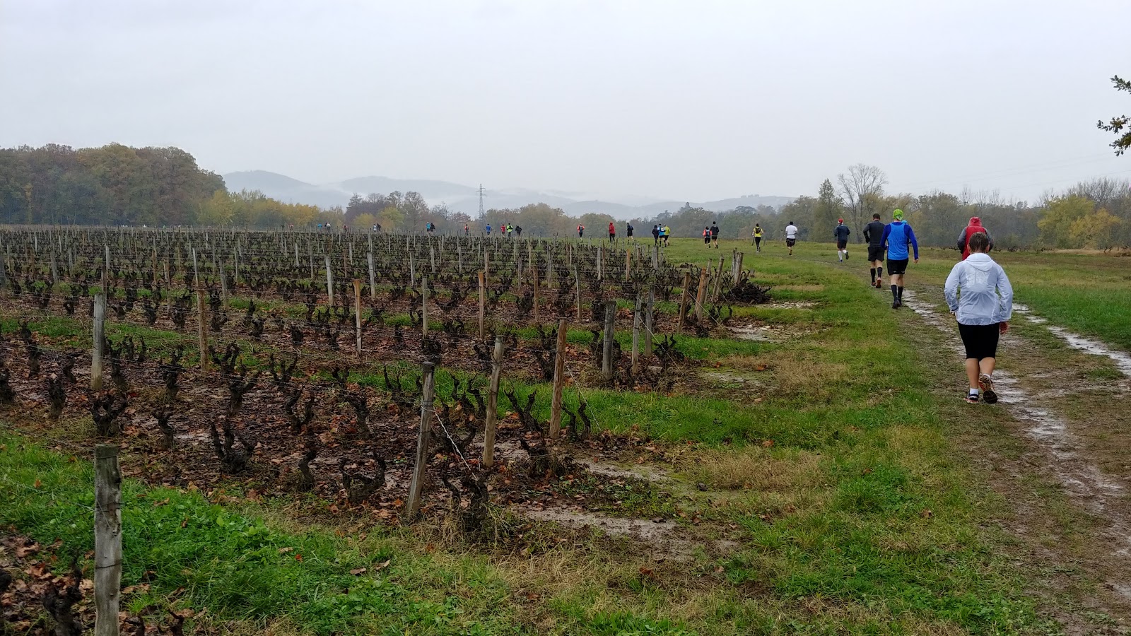 Les 4,5 kilomètres qui suivent sont sans pitié pour ceux qui se prennent le fameux mur, car ils sont globalement montants, et avec pas mal de chemins qui commencent à devenir glissants avec la pluie. Le cardio monte d'un cran mais je garde le rythme sans trop souffrir. Je crois que le vin inhibe les petites douleurs et exacerbe mon enthousiasme, je me sens bien de tenter le sub-4h là !