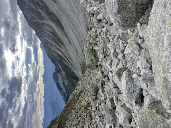 Le col de la Meina est moins sympathique, j’ai du mal à trouver le passage dans la descente, j’y casse un bâton en tentant de me rattraper d’un déséquilibre entre 2 blocs. Je rencontre Tim le suisse, nous ferons route commune jusqu’à la prochaine Base vie. Sans doute due au manque de sommeil, nous trouvons le temps long sur ce chemin monotone etinterminable.