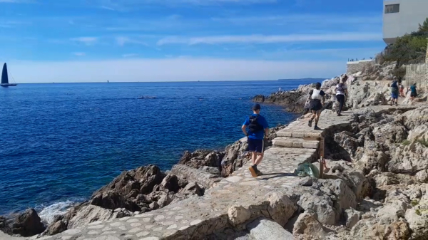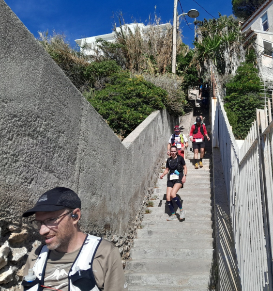 Je prends mon temps au ravito du plateau St Michel, il ne reste plus que la descente sur Nice. Sur le parcours nous sommes maintenant avec les coureurs du 20K autant dire que ça pulse, c'est difficile pour moi de m'insérer dans le trafic dans certaines parties un peu technique sans gêner les plus rapides. La fin de la descente c'est des escaliers raides avec juste la place pour poser les talons.