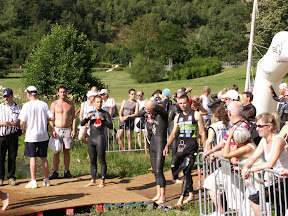 Natation, 2.7 kms : Les arbitres nous demandent d'avancer, les premiers ont les pieds dans l'eau, les autres loin derrière, et BANG, le départ est donné....tout le monde n'est pas dans l'eau. Pas de précipitations, je marche un maximun, puis entame ma natation. Je ne prendrai aucun coup au départ.