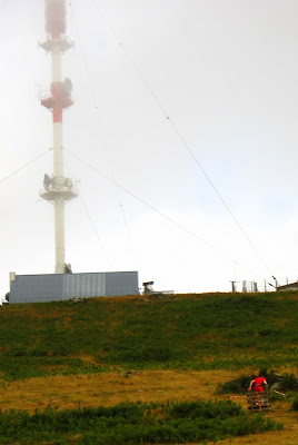 A travers champs et chemins en bordure de forêts on approche de l'antenne, point culminant de la course, pour le moment cachée dans la brume.