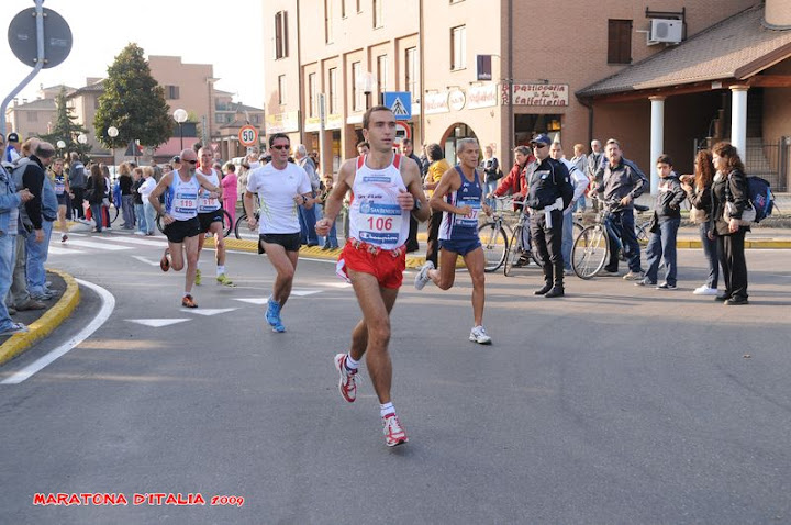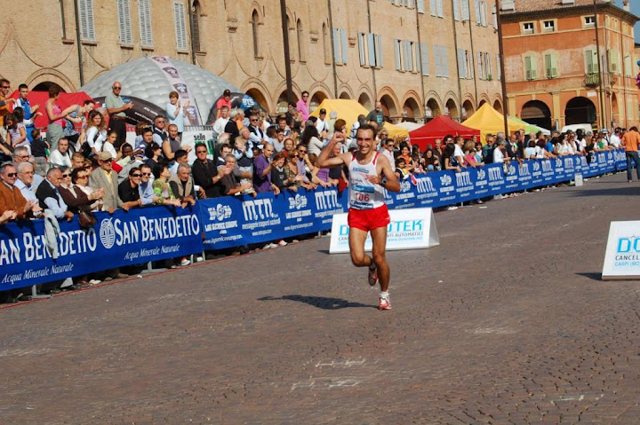 A chaque km passé, mes calculs s'améliorent car je passe en 3'53'' au km 36, puis en 3'48'' au km 37 et en 3'55'' au km38. Je reviens enfin sur des coureurs, on m'annonce 24ème et je dois pouvoir reprendre quelques places dans le final malgré la crise. Je passe un premier coureur qui marche à cause de crampes. Je l'encourage mais il ne repart que doucement. Puis je double une Russe TOP RUNNER: Valentina Galimova qui va exploser car elle finira en 3h06' neuvième Sénior Femme. Me voici 22ème. Je l'encourage mais elle ne s'accroche pas. Je passe en 3'49'' et 3'48''. Le mollet sont dures comme des morceaux de bois. Je suis au dernier ravitaillement, et deux coureurs sont juste devant. Je vais les passer, il y a encore une Russe TOP RUNNER: Natalia Sergeva qui finira troisième,un m'encourage et ils me laissent partir. Je les doubles en donnant un accélération. Je rentre dans Carpi 20ème. On descend la rue piétonne. Je rattrape un coureur. Je reste derrière. Nous voyons la ligne d'arrivée mais nous devons faire encore un km. Dans la montée je passe en accélérant. Ça passe ou ca casse mais il faut essayer de faire la différence dans l'élan. Ça monte un peu et on tourne à droite en haut. Nous passons à l'ombre. Encore un coureur devant à 100m.