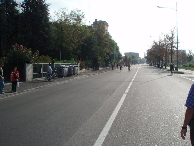 Un Italien me suis en vélo et me donne quelques encouragements. Nico et Marco seront bientôt là au semi. Les rues sont larges et vides. L'australien dossard 1 a déjà un peu de retard sur le groupe de tète. Les deux lièvres font encore leur travail et le feront jusqu'au km30.